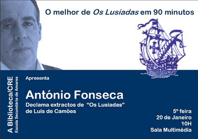 No passado dia 20 de Janeiro, o actor António Fonseca esteve na nossa Escola, numa actuação com um reconto performativo dos cinco primeiros Cantos de Os Lusíadas. A iniciativa, da responsabilidade da Biblioteca, proporcionou um momento único a mais de 200 alunos de 9º e 12º anos, que têm vindo a estudar a obra de Camões. Durante duas horas, António Fonseca declamou, de memória, extractos dos cinco primeiros cantos de Os Lusíadas, interpretando os seus personagens, relatando momentos, explicando passagens, explicitando partes para os alunos, mantendo-os “presos” a um texto, tantas vezes de difícil compreensão para os mais jovens.